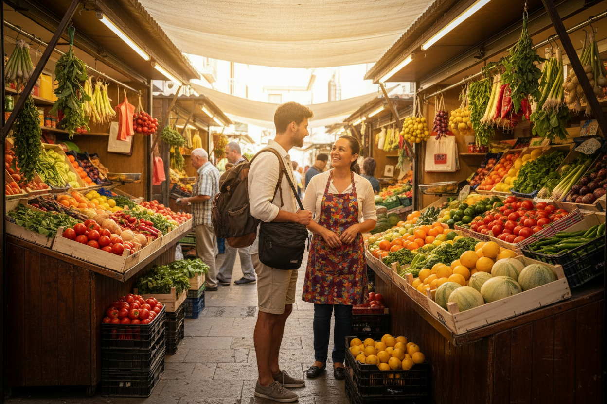 Les épices, les citrons, les voix qui s'entremêlent. Tu tends la main vers un étal, tu demandes en espagnol — et la vendeuse te répond avec un grand sourire. C'est ça, connecter avec les locaux.