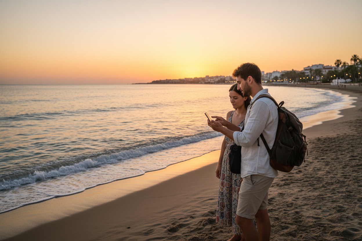 Ils marchaient dans le même sens, au bord de la mer, le soleil disparaissant à l'horizon. Il a ralenti, elle aussi. "Bonita tarde, ¿verdad?" — Belle soirée, n'est-ce pas ? Elle a ri. La conversation a coulé naturellement, et avant la nuit tombée, il lui dit : "¿Te apetece compartir una paella?" La phrase lui a échappé avant même qu'il réalise. Elle a levé les yeux, surprise, puis sourit. Il n'en revenait pas lui-même d'avoir osé. Elle non plus — mais elle a dit oui.